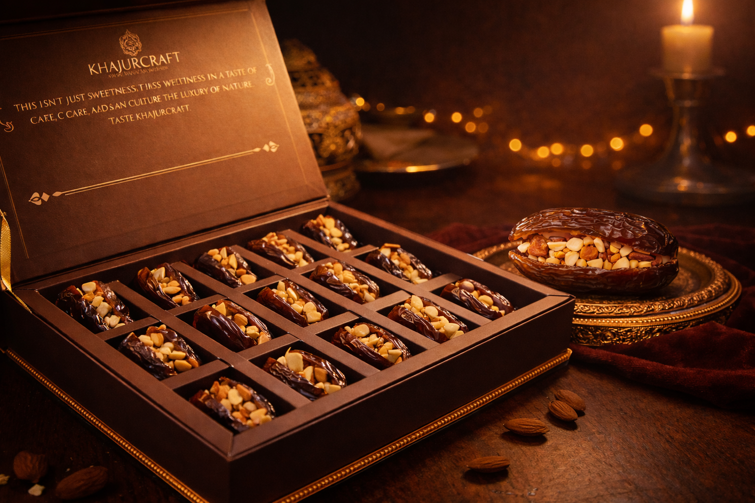 Premium almond-filled dates crafted for a rich, luxurious, and unforgettable taste experience. Perfect for gifting and special occasions.